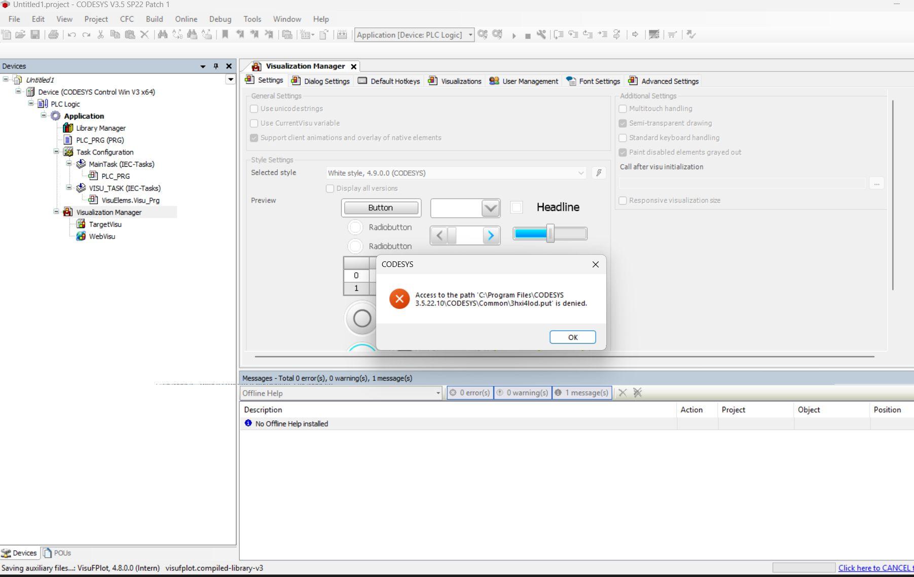 Then I've add the object "Visualization Manager" and then tried to create a project archive (File->Project Archive->Save Archive), but it fails with the error "Access to the path 'C:\Program Files\CODESYS 3.5.22.10\CODESYS\Common\3hxi4iod.put' is denied".