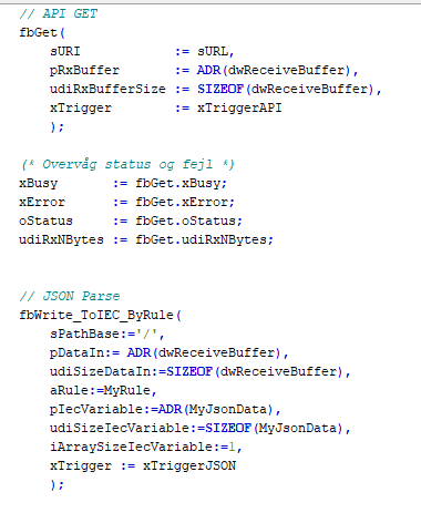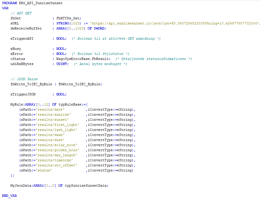 VARFbHTTPs_Get_1 : FbHTTPs_Get;// INputsURI : STRING(1023):='https://www.nordpoolgroup.com/api//marketdata/page/10';eAuthentication : eAuthentication :=1; array_pRxBufferUNIO : ARRAY[1..255] OF DUT_Norpolbuffer;udiRxBufferSize : UDINT :=1024; // receive buffer sizetTimeout : TIME; //InoutxTrigger : BOOL; // perform a request//OutputxBusy : BOOL; // job in progressxError : BOOL; // job finished with erroroStatus : FbResult; // WagoSysErrorBase // detailed status informationudiRxNBytes : UDINT; // Number of Bytes, that have been received by the Get-command//Oscat BUFFER_TO_STRINGuiStart : UINT := 1 ;uiStop : UINT := 500;tekst1 : STRING(2000);Fb_JSON_ParseAndModify_0 : Fb_JSON_ParseAndModify;xTriggerJSON : BOOL;oStatusJSON : WagoAppJSON.WagoSysErrorBase.FbResult;xErrorJSON : BOOL;xDoneJSON : BOOL;diTokenJSON : DINT;END_VAR