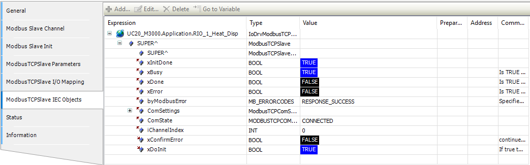 I would expect that the Modbus interface is generating a timeout after 1 sec, because this is how it is setup (Modbus_settings.png), but this is not what happens. I have thought to write a piece of code that writes xBusy to false when it is stuck but because it is an output I'm not able to write to it.