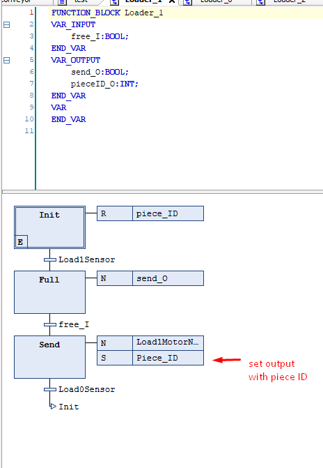 gvl.piece_ID:=pieceID_O;simultaneously the next conveyor stores that ID with this action:
