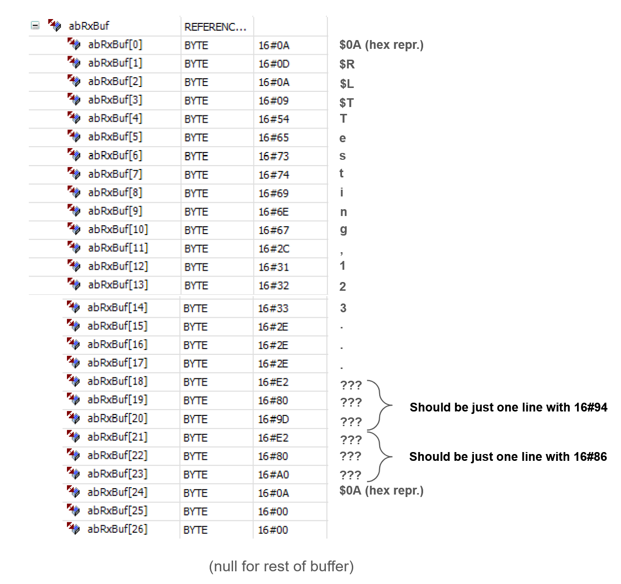 Escaped characters, like $T, $N, etc. work just fine, and so do their hex representation counterparts ($09, $0A, etc). However, when I put something like $94, I get a set of nonsense values... see image attached after one spin of the program.
