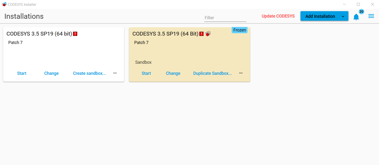 I created a new sandbox image on the D drive with Codesys Installer.