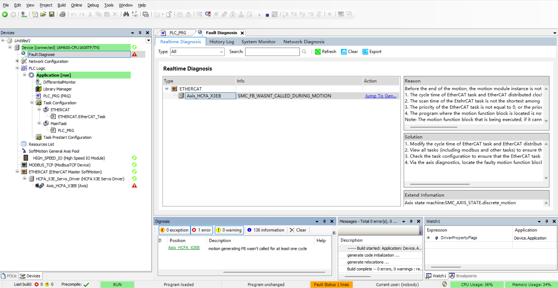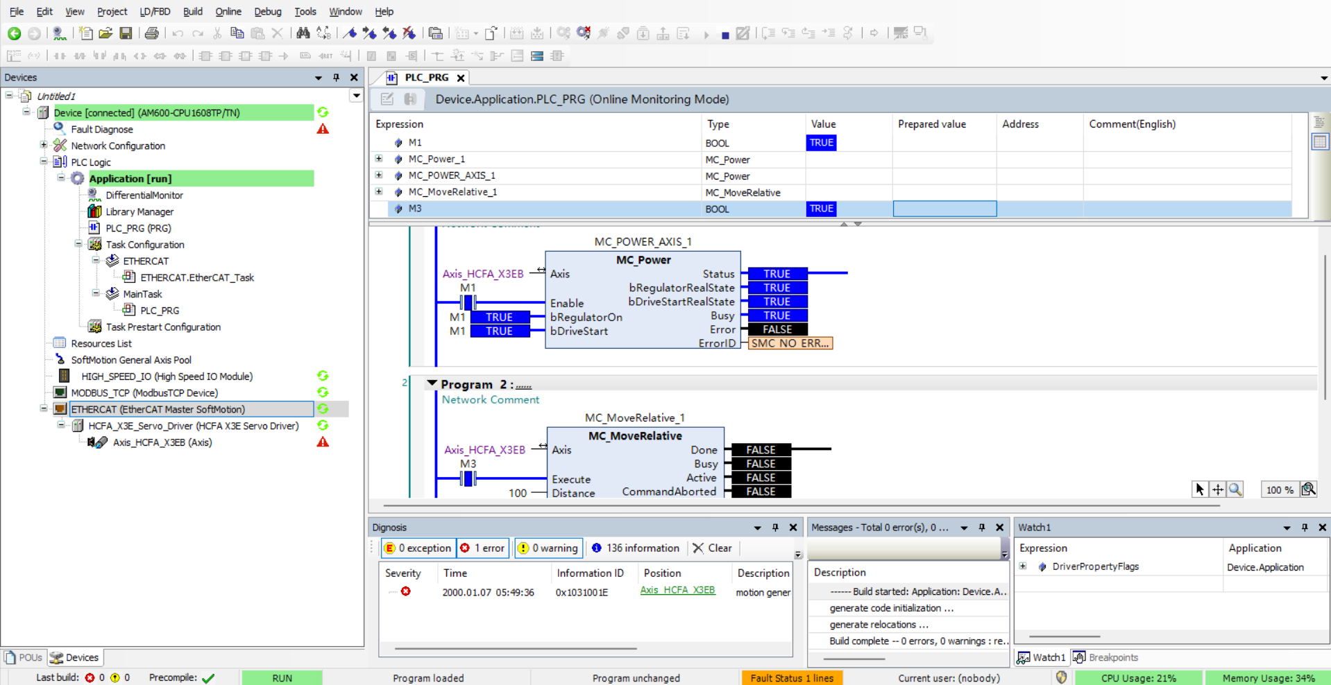 I am using an Inovance PLC to control a servo via EtherCAT. When I enable MC_POWER, the drive switches to Run mode successfully. After that I call MC_MoveRelative, but I get the error SMC_FB_WASNT_CALLED_DURING_MOTION. The servo vibrates but the motor shaft does not move.