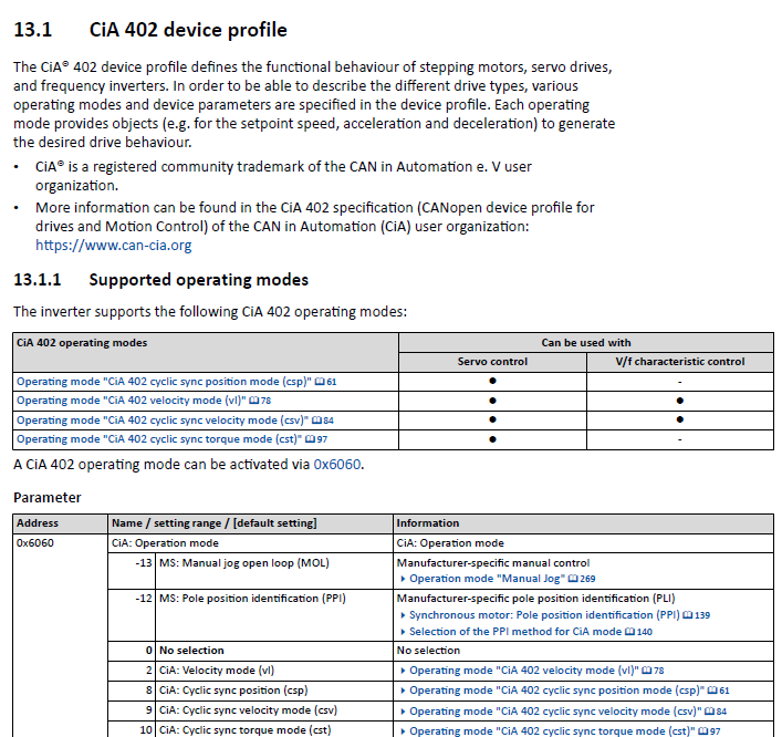 In order to use SoftMotion Light, a servo drive needs to support CiA 402 operating modes: Profile Position (PP), Profile Velocity (PV) and Homing Mode (HM).