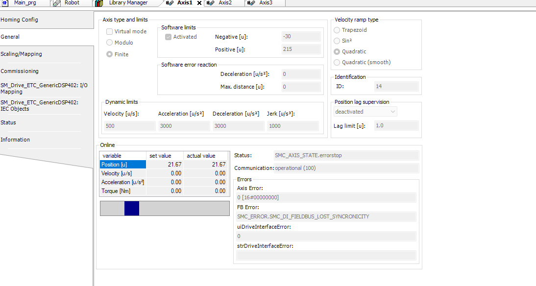 Check attached image. I am getting SMC_ERROR.SMC_DI_FIELDBUS_LOST_SYNCRONICITY in all 3 axes.
