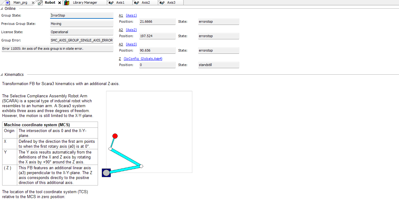 I am using Scara3 kinematic with EtherCAT PLC. The robot stops at the same place randomly after few cycles. Check attached image. I am getting SMC_ERROR.SMC_DI_FIELDBUS_LOST_SYNCRONICITY in all 3 axes.