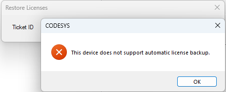 I also tried using Additional Functions > Restore Licenses with the Ticket ID and got the following message: