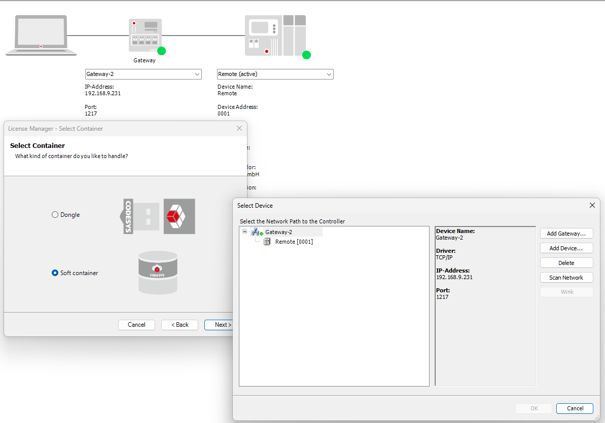 I have CODESYS Control SL running on my device, as well as CodeMeter. I purchased a license, and installed it to the CODESYS Development system, (Tools >> License Repository) then tried to install to the device (Tools >> License Manager >> o Device >> o Soft container >> Remote [0001] >> OK.