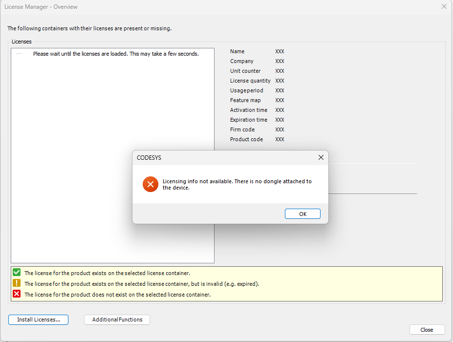 This gives me the "License Manager - Overview" dialog, and the message "Licensing info not available. There is no dongle attached to the device."