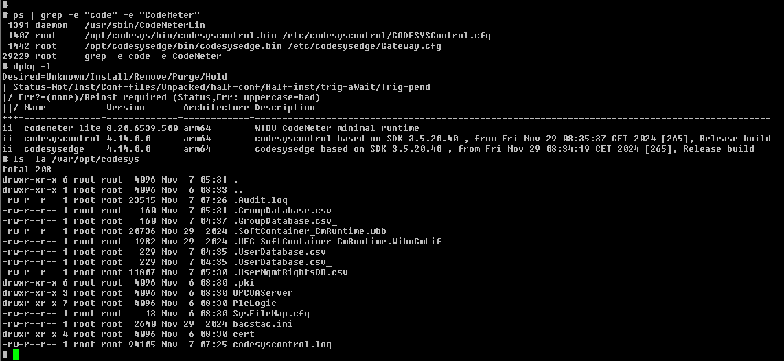 Below shows the running applications, installed packages, and current content of /var/opt/codesys