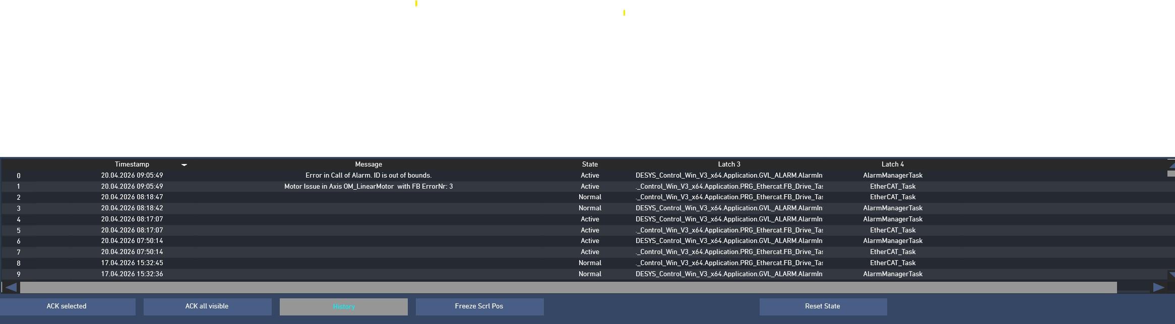 I'm using a webvisu on a control Win V3 SoftPLC. My issue is with the Alarm Managers Alarm history. It does create entry's and does also show the latch data. But it only shows the message of the active alarms. In the history the message is empty (also in the .csv Export file). The archiving in the alarm group is checked and the Alarm storage is activated.